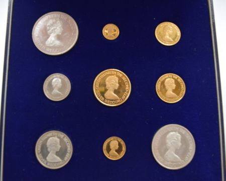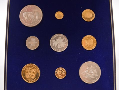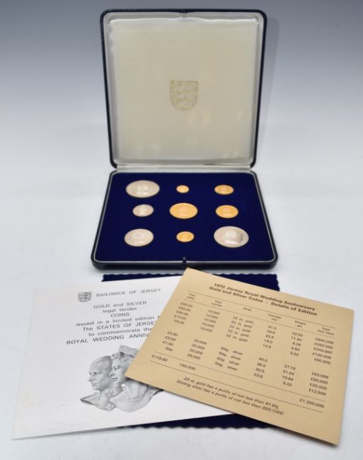 Jersey 1972 Royal Wedding Anniversary gold and silver proof cased coin set comprising £50, £25, £20, £10 and £5 gold coins, total weight of 22ct gold coins 51.05g, and £2.50, £2, £1 and 50p, total weight of silver coins 65g, in original fitted case with certificate