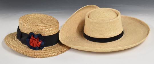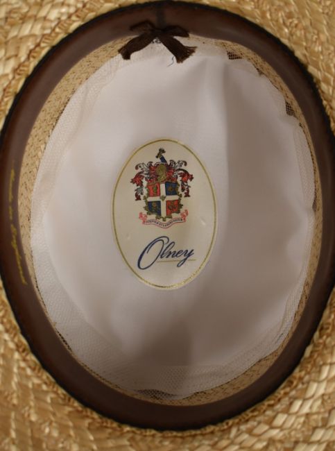 Straw boater by Olney with leather band, size 6 7/8, together with another straw hat of similar size