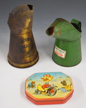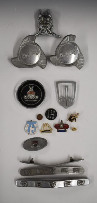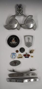 Motoring collectables including leaping jaguar mascot, badges and clocks including Jaguar and Rover, Jaguar spinners, photo album of classic cars, two oil cans and a John Bull badge