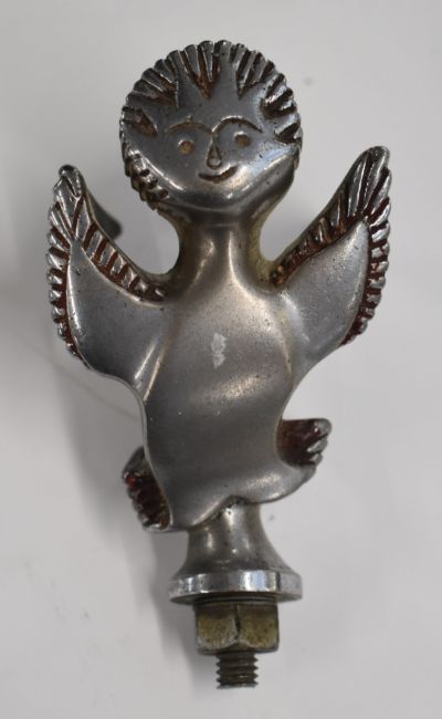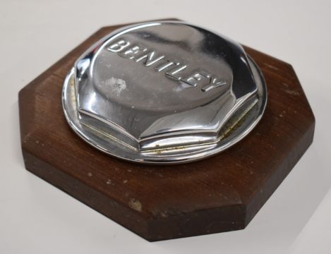 Novelty car mascot Mr Therm for the Gas, Light & Coke Company, numbered 435 verso, height 11.5cm, two Bentley hub caps and a Bentley badge