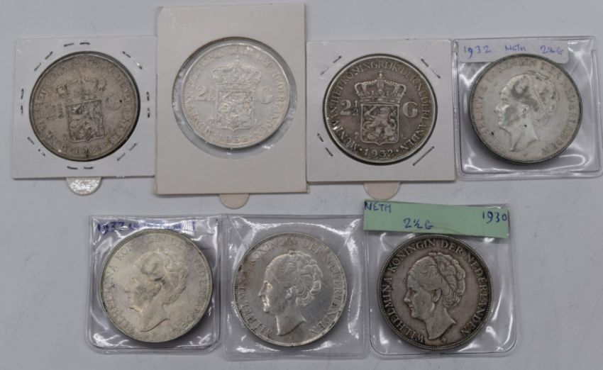 Six Nederland silver 2½ Gilder coins including 1929, 1930, 1932, 1937 and 1938