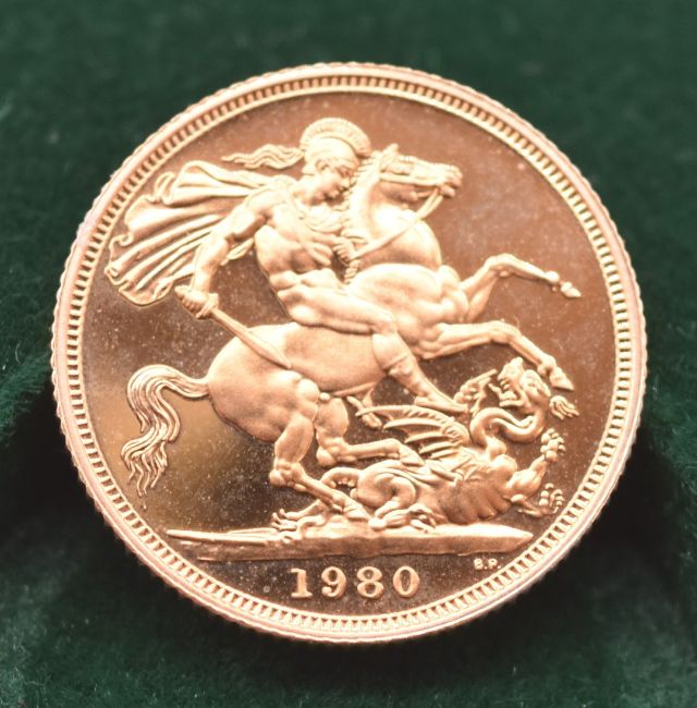 Queen Elizabeth II 1980 proof gold full sovereign, in case
