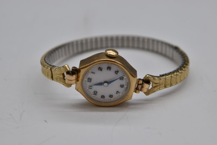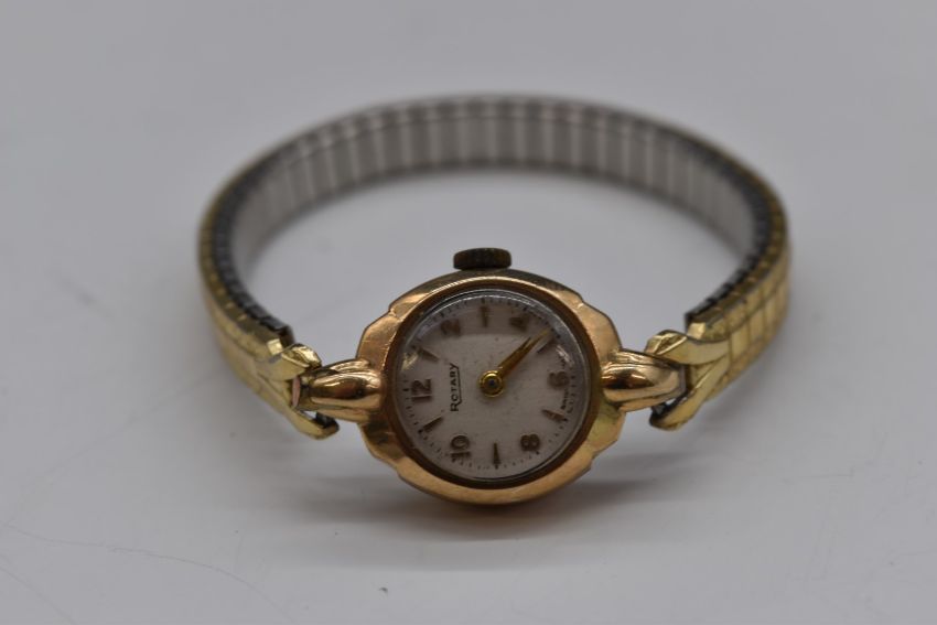 Four ladies and gentleman's wristwatches comprising Helvetia military style and Rotary Flyer both on leather straps and two 9ct gold examples both on expanding gold plated bracelets.