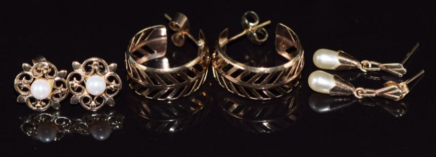 Three pairs of 9ct gold earrings, one pair set with pearls, one with faux pearls and the other hoops, 2.1g