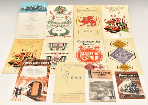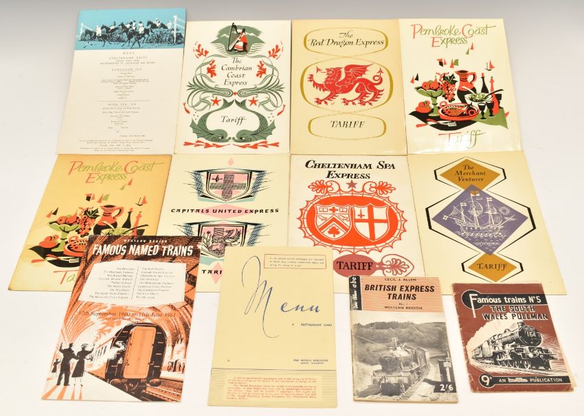 Western Region and Welsh British Railways brochures comprising The Merchant Venturer, Cheltenham Spa Express, Capitals United Express, two Pembroke Coast Express, The Red Dragon Express, and The Cambrian Coast Express tariffs, restaurant cars menu, Western Region Famous Named Trains 1960/1 booklet, 1966 Cheltenham Races menu and Ian Allan British Express Trains western region and South Wales Pullman books