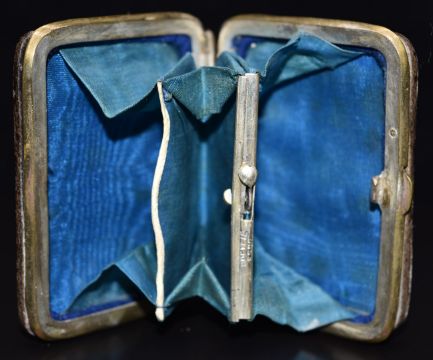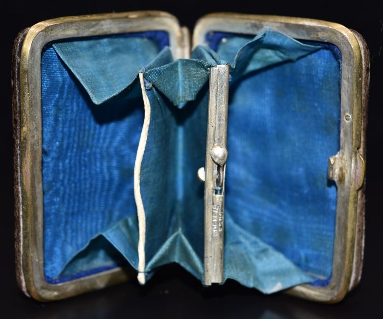 Late 19th/early 20thC French silver inlaid brass bound piqué purse decorated with a rose and with blue silk fitted interior, Brevete SGDG to clasp, 5 x 6.5cm