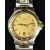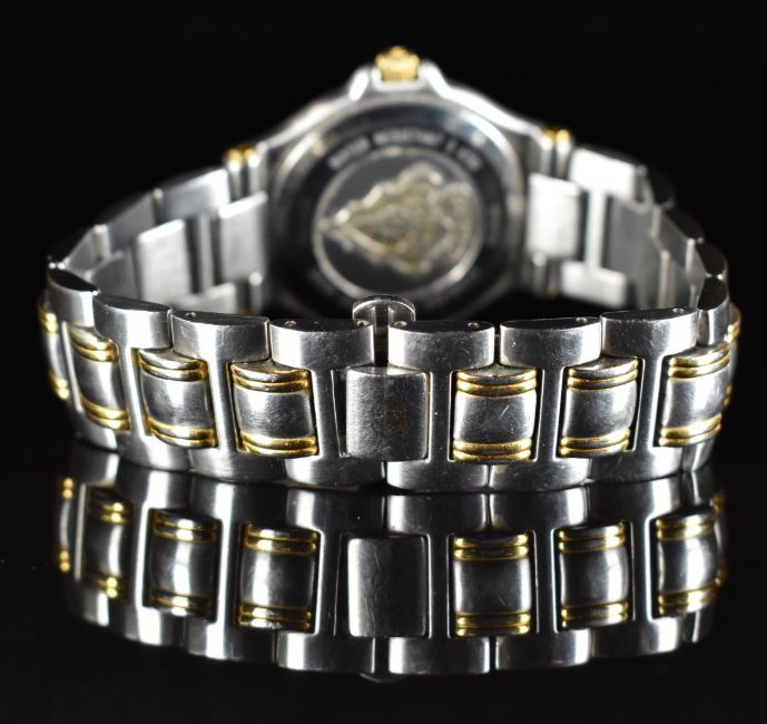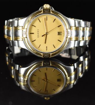 Gucci wristwatch ref. 9040M with date aperture, gold hands and dial, gold plated bezel, stainless steel case and quartz movement, on two-tone bracelet, case diameter 35mm.