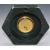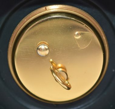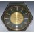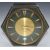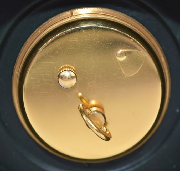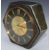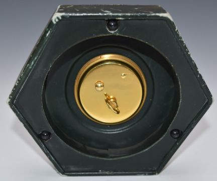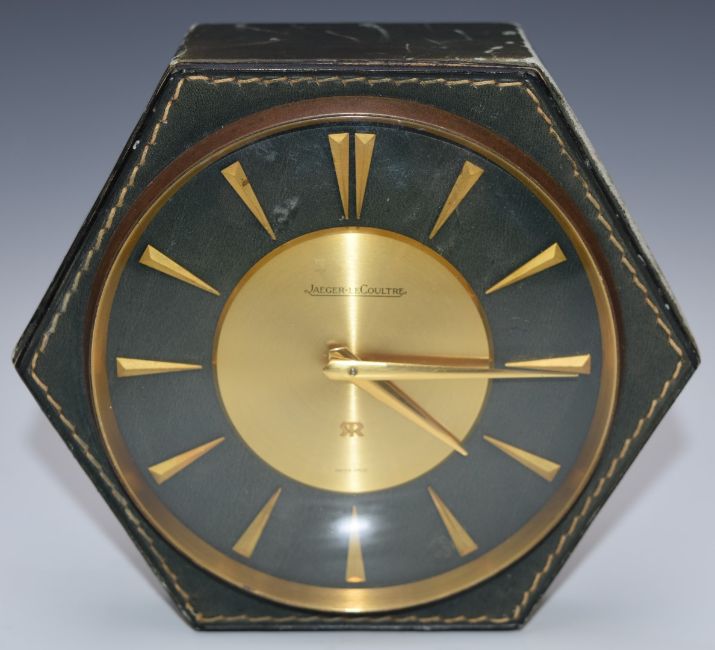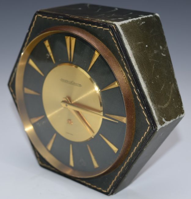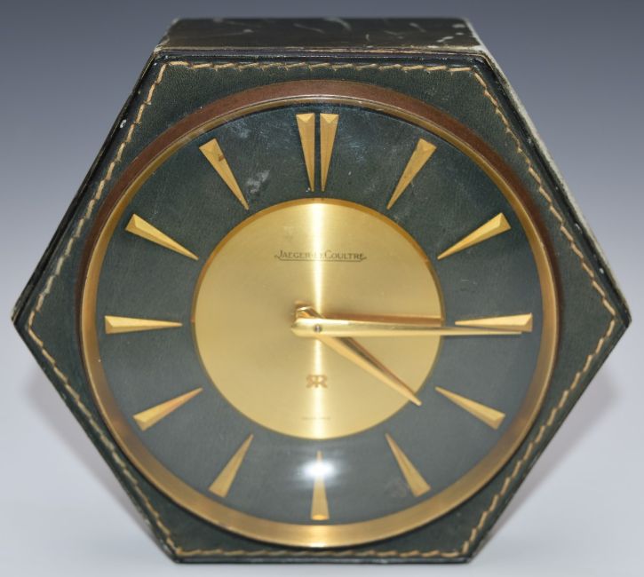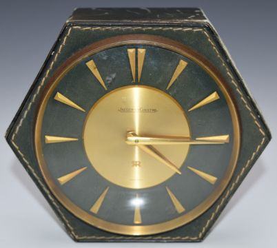 Jaeger-LeCoultre SR desk clock with gold hands, dial and hour markers and hexagonal green leather case, case diameter 12cm.