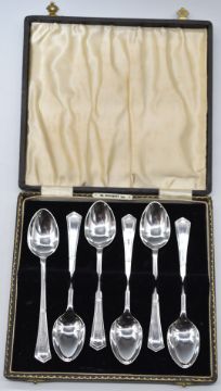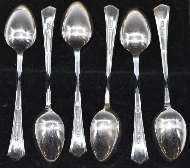 Cased set of six Art Deco hallmarked silver teaspoons, Sheffield 1936, maker Angora Silver Plate Co, weight 98g