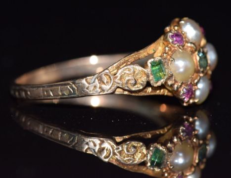 Victorian ring set with split pearls, tourmaline and garnet, 1.8g, size O