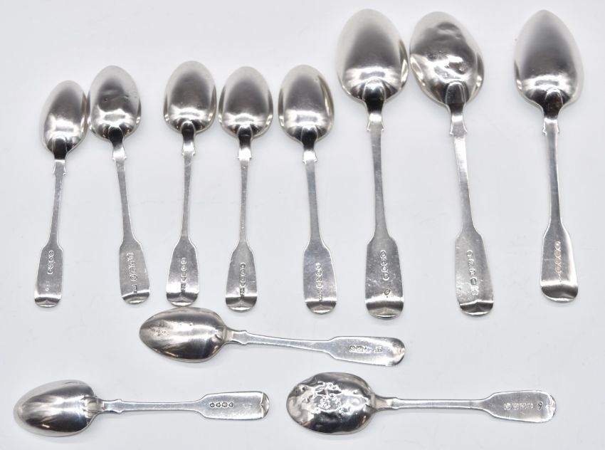 Fiddle pattern hallmarked silver spoons comprising three dessert spoons and 8 teaspoons, including some Exeter examples, length of longest 18cm, weight 278g