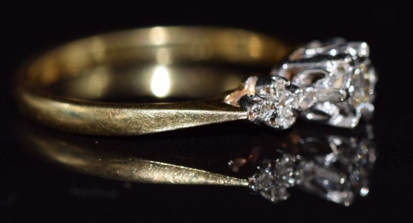 An 18ct gold ring set with a diamond, and four further diamonds to each shoulder, 3.6g, size P