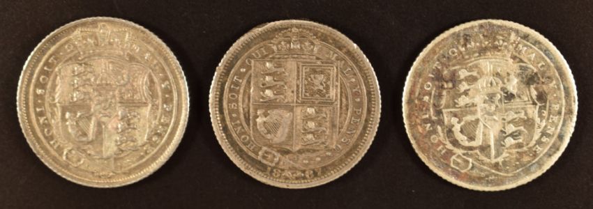 Two George III bull head sixpence and a Queen Victoria Jubilee 6d