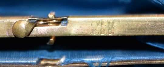 Late 19th/early 20thC French gold inlaid brass piqué purse with polka dot decoration/banded border, with blue silk fitted interior and Brevete SGDG to clasp, 5 x 8cm