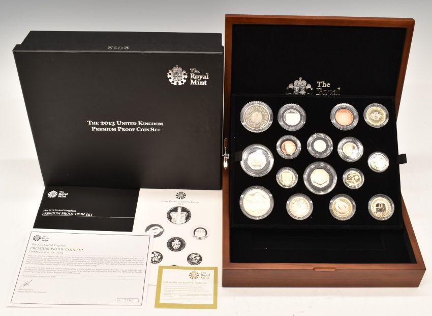 Royal Mint 2013 premium proof coin set with booklet, in wooden case and outer box