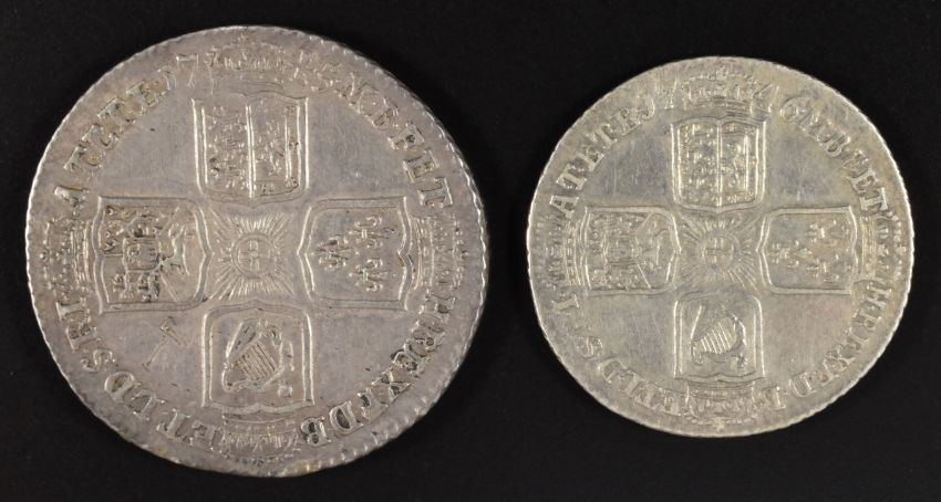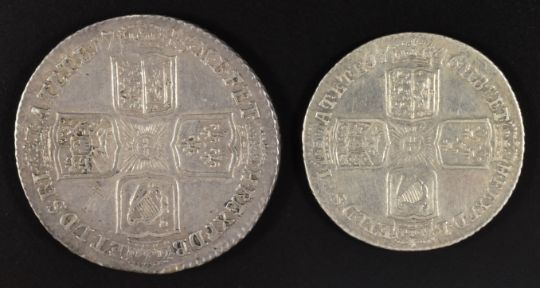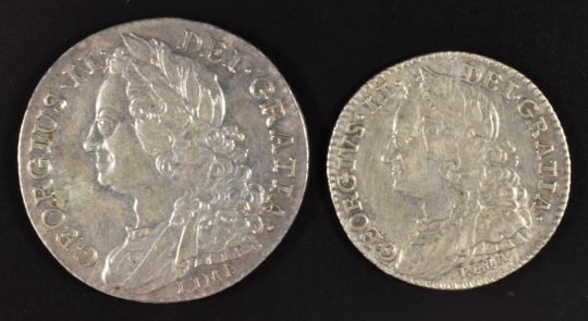 George II shilling 1745 Lima issue, Seaby 3703 (GVF) and a 1746 Lima sixpence (NVF)