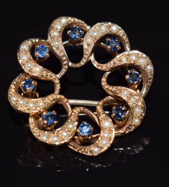 A 9ct gold brooch set with sapphires and seed pearls, 4.8g, 2.2cm