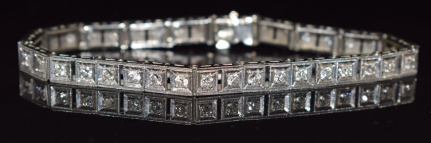 A 14k white gold tennis bracelet set with diamonds each approximately 0.07ct each, 17.5cm long, 11.4g