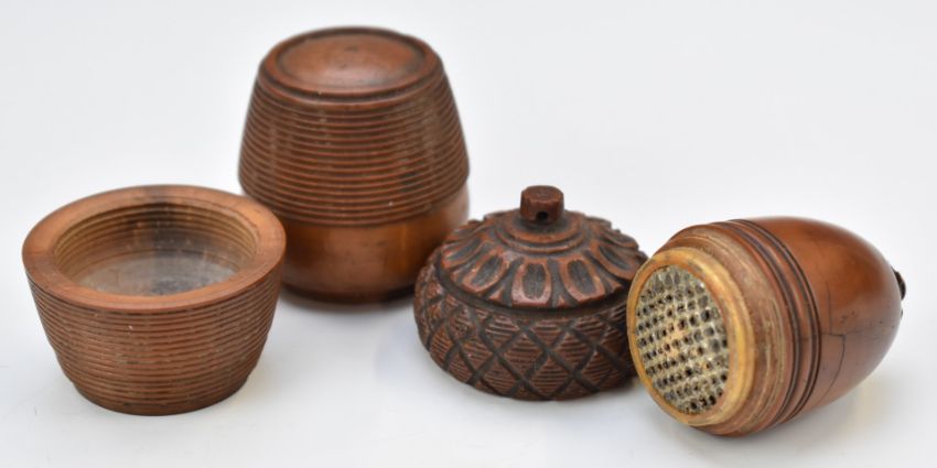 Two 19thC treen nutmeg graters, length of larger 6cm
