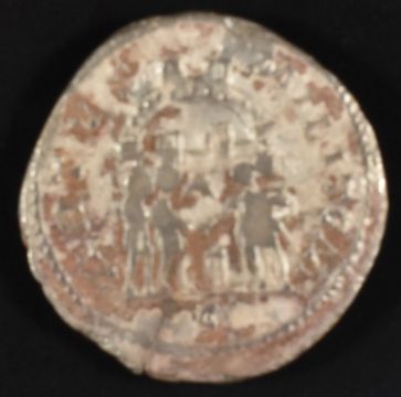 Roman Imperial coinage The Tetrachy AD285-307 Diocletian AR Argenteus. Virtus Militum Diocletian Maximianus, Constantius and Galerius sacrificing in front of camp gate, diameter 16mm