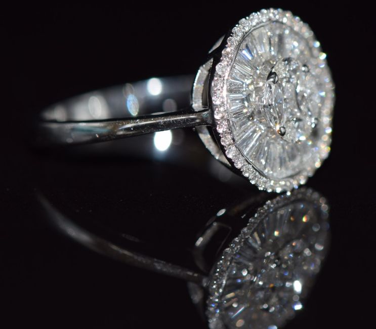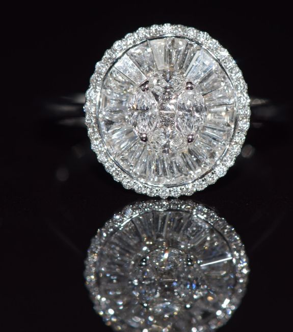 An 18ct white gold ring set with princess, marquise, baguette and round cut diamonds totalling 1ct, 3.6g, size M