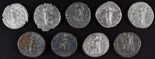 Roman Imperial coinage Adoptive Emperors AD96-138 nine various silver Denarius to include Hadrian Sabina wife of Hadrian, Matilda his mother in law and Aelius under Caesar, diameter 17mm