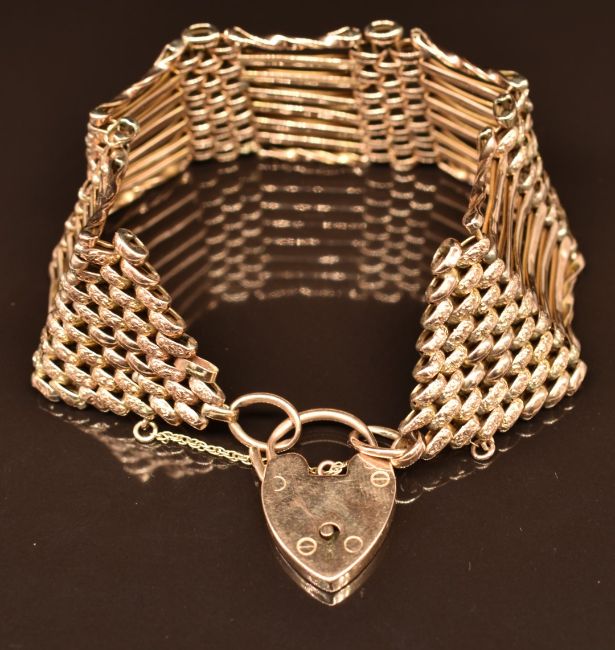 A 9ct gold gate bracelet with heart padlock clasp, 25.9g