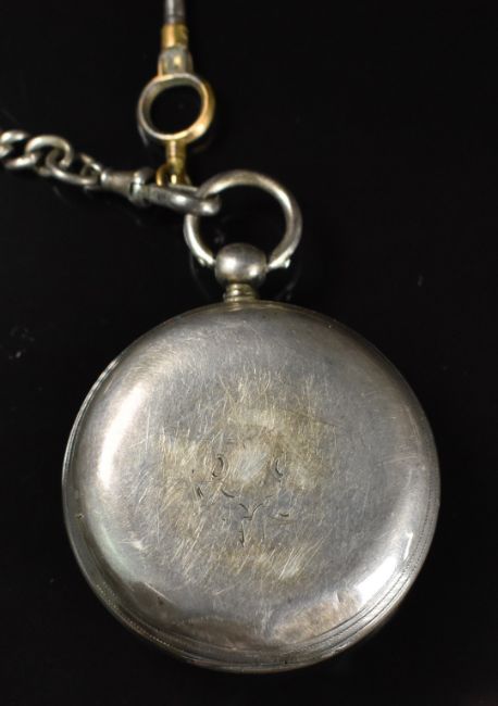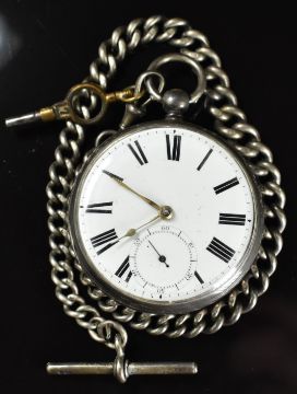 Unnamed hallmarked silver open faced pocket watch with subsidiary seconds dial, gold hands, black Roman numerals, white enamel dial and engraved movement, on hallmarked silver graduated chain, case diameter 52mm, serial number 5289, 175g.