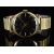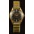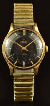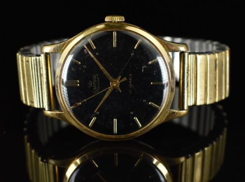 Smiths De Luxe gold plated gentleman's wristwatch with gold hands and baton markers, black dial and 17 jewel movement, on expanding metal bracelet, case diameter 32mm.