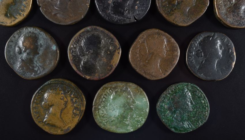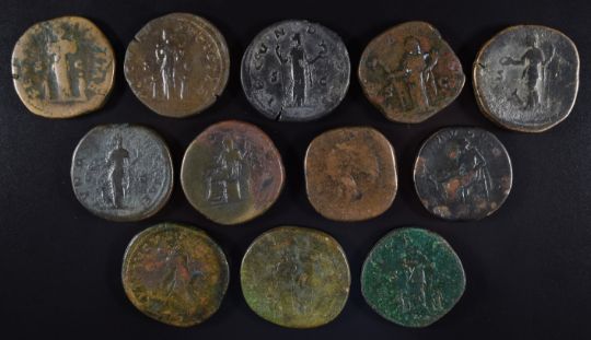 Roman Imperial coinage The Antonines AD138-193 Faustina Junior twelve various bronze coins Sestertius, includes French hoard example, struck under Marcus Aurelius etc., diameter 29-32mm