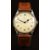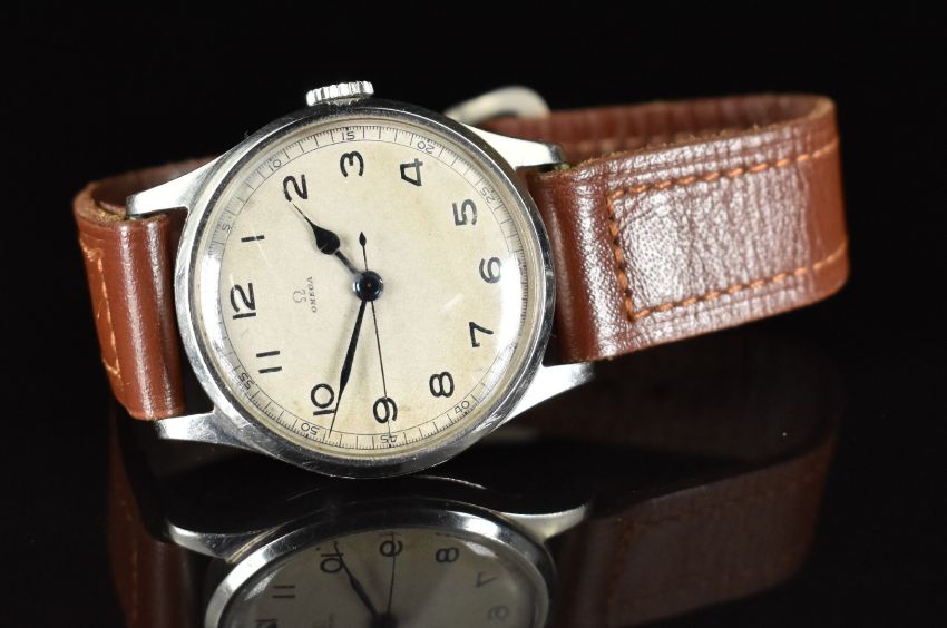 Omega gentleman's wristwatch with blued hands, Arabic numerals, silver dial, stainless steel case and signed movement, on brown leather strap, case diameter 33mm.