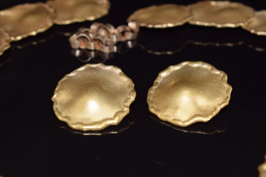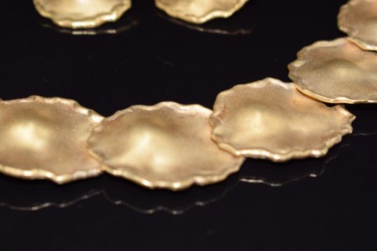 Bespoke 9ct gold abstract disc necklace with matching earrings, 129g, 45cm long