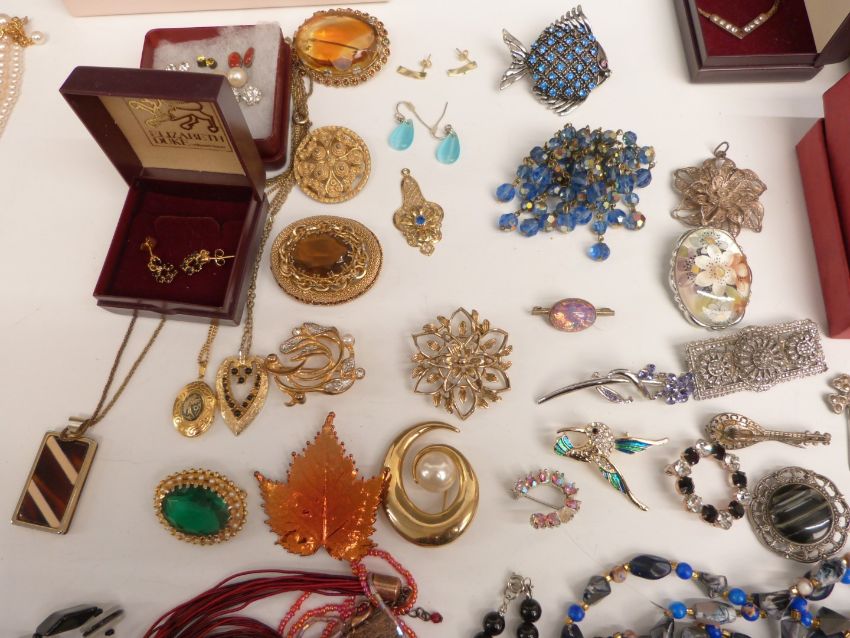 A collection of jewellery including three strand pearl necklace, pearl earrings, silver and pearl pendant, silver ingot, vintage brooches, etc