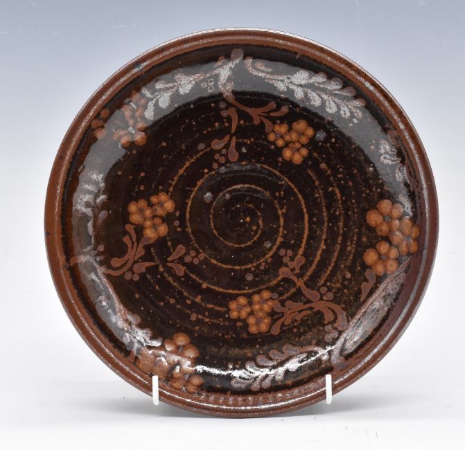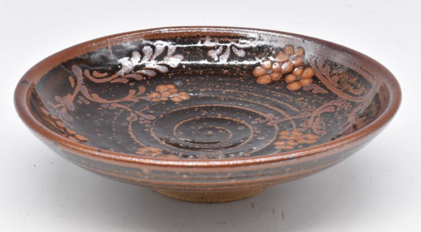John Calver studio pottery pedestal bowl with foliate decoration, diameter 23, H6cm