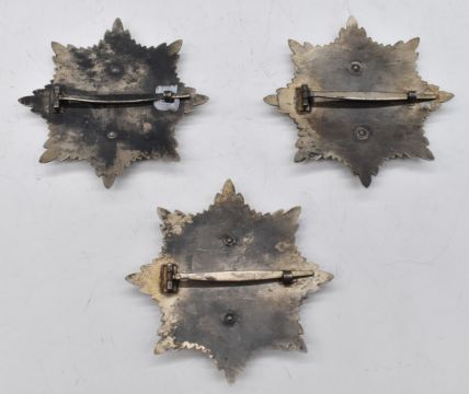 Three reproduction German Nazi Third Reich D.A.P medals/badges together with a wreathed swastika on chain