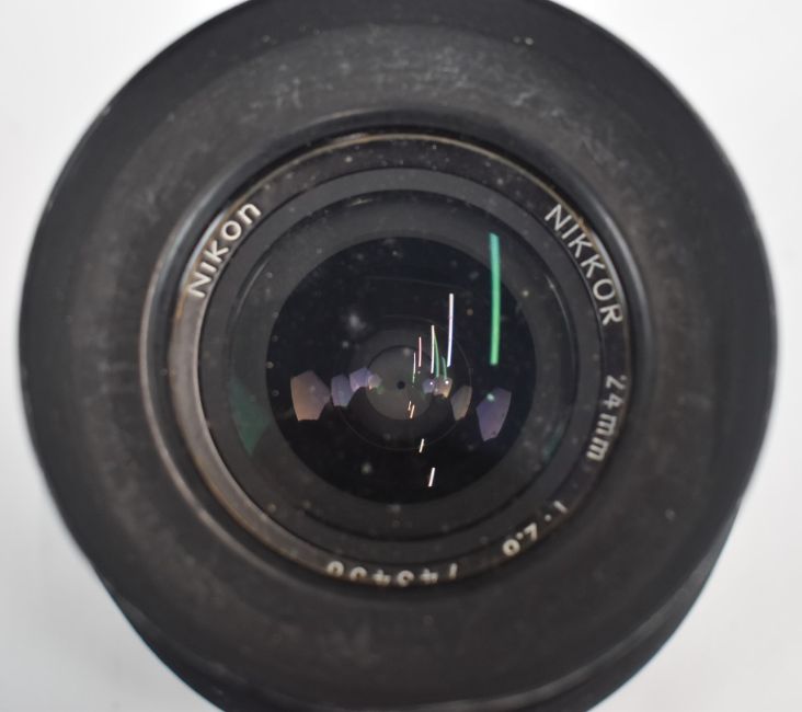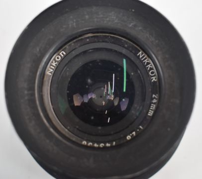 Two Nikon SLR camera lenses comprising 24mm 1:2.8 and 50mm 1:2