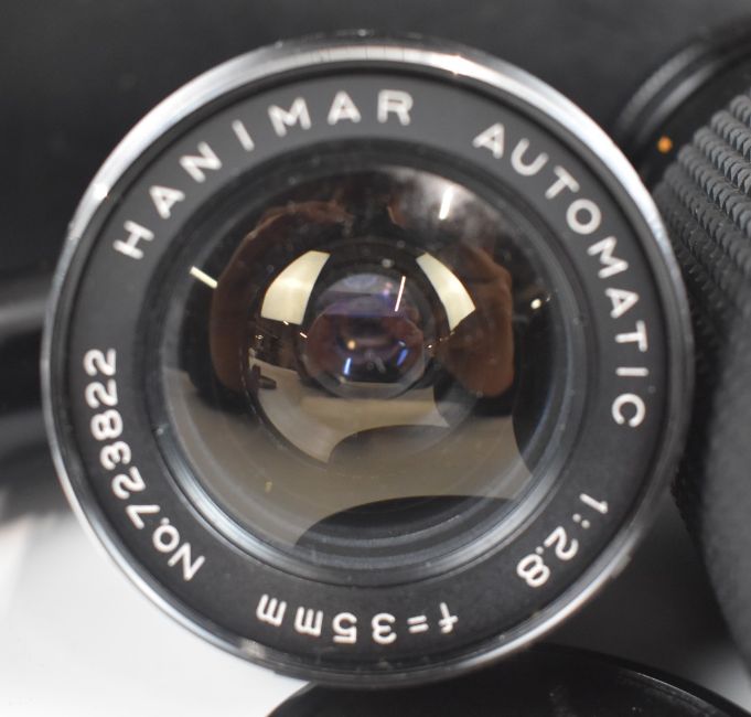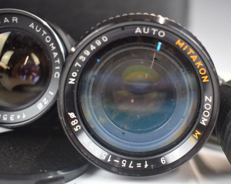 Camera lenses, accessories, films etc in hard case including Cosina auto MC F = 2.8 135mm, Hanimar Automatic 1:28 35mm, Auto Mitakon zoom MC 1:3.9, 75-150mm, 58 no 739490, Regent teleconverter x 2 etc