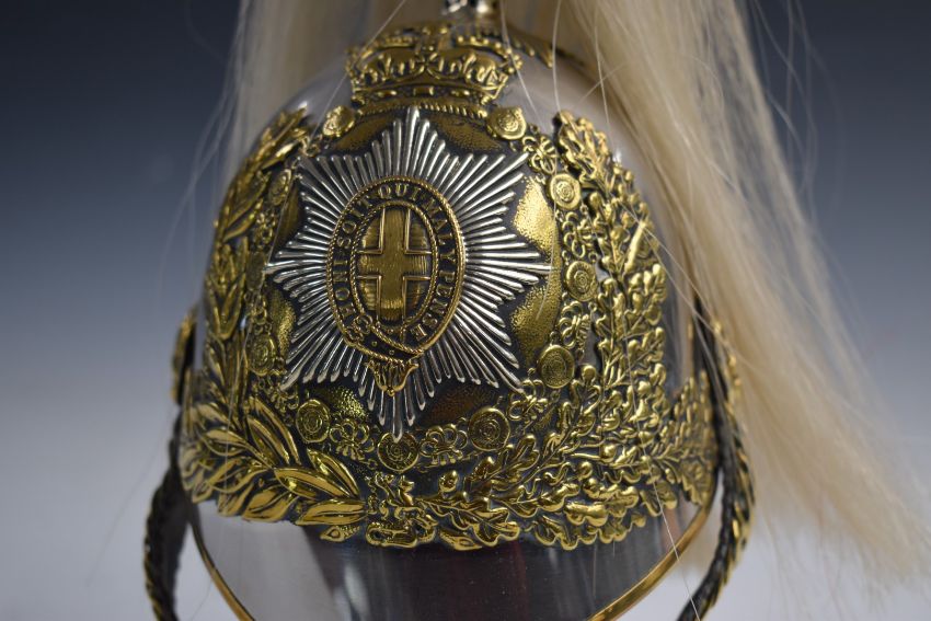 Scale replica Household Cavalry Lifeguard helmet on stand, H39cm