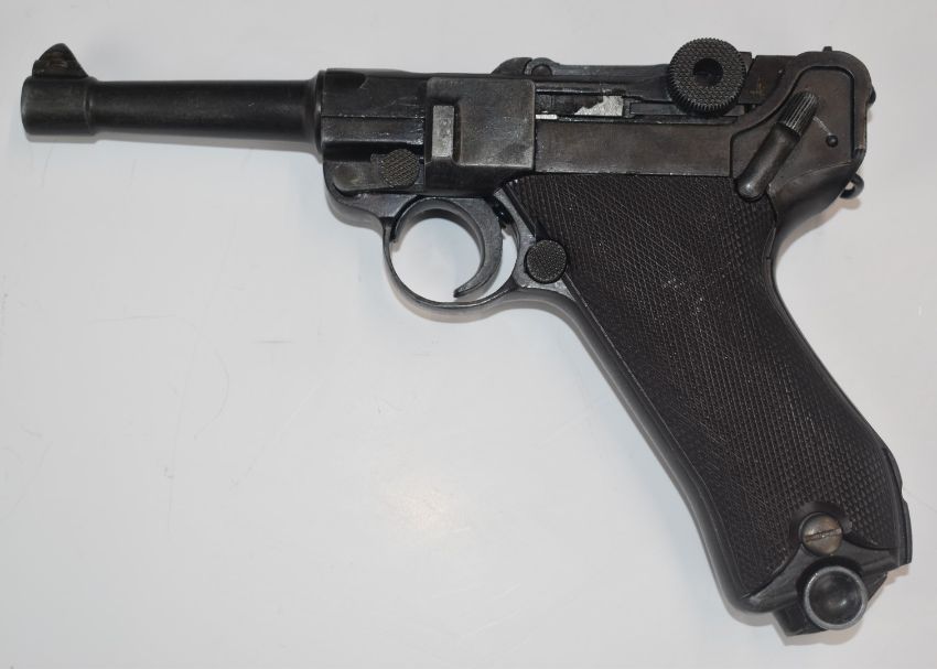 Replica German Luger semi-automatic pistol with chequered composite grips, NVSN, in leather holster.
