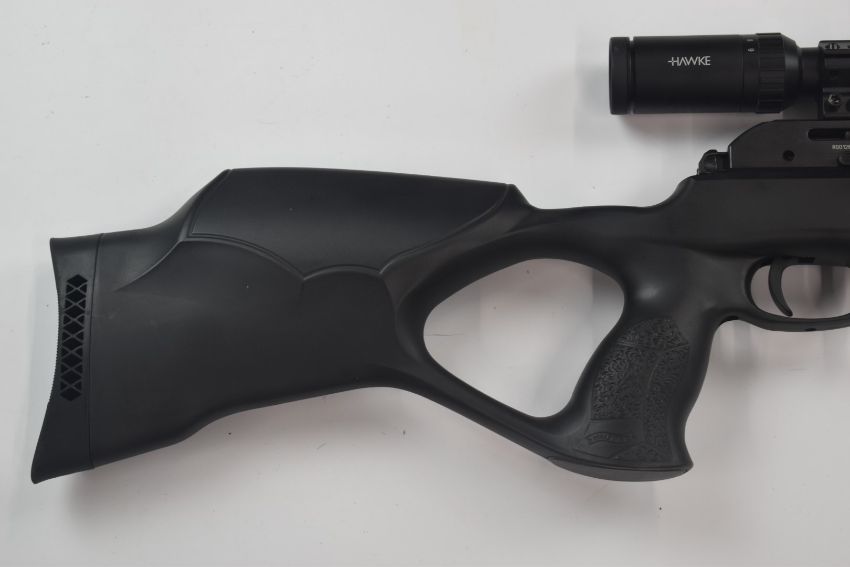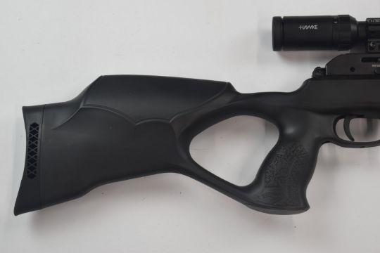 Walther Rotex RM8 .22 PCP air rifle with shaped composite grip and stock, adjustable trigger, 8-shot magazine and Hawke Fast Mount 3-9x40 Mil Dot scope, serial number R0012695, together with an Umarex re-filling pump.