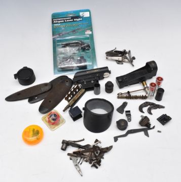 A collection of gun parts and accessories including Beamshot Airgun Laser Sight, snapcaps, cleaning kit, sights etc, some in original packaging.