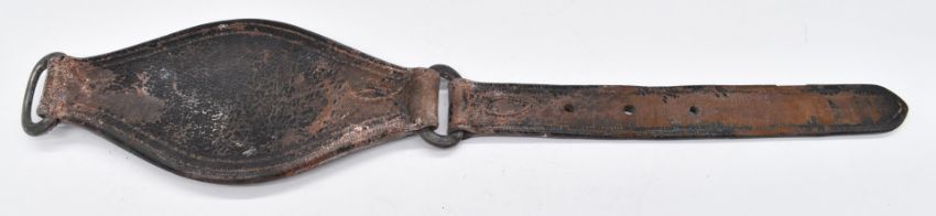 Possibly British WW1 King's (Liverpool) Regiment 17th-20th Battalion, Liverpool Pals, leather horse breastplate furniture part with silver crest for the Stanley family Earl of Derby, eagle and child below Earl's crown and motto Sans Changer, 21cm long, with 25cm strap