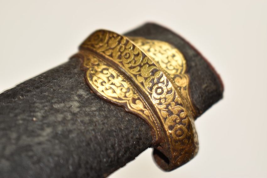 Spanish or similar Toledo ware dagger with horn handle, gold engraved and inlaid mounts and 37.5cm double edged blade engraved with Persian or similar script, in bone tipped leather scabbard, overall length 51.5cm. PLEASE NOTE ALL BLADED ITEMS ARE SUBJECT TO OVER 18 CHECK ON COLLECTION OR DELIVERY