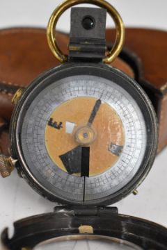 British Army WW1 marching compass MK V by Short & Mason Ltd, London No254 dated 1904 with broad arrow, named to M MacLeod, complete with leather case, together with a Princess Mary Christmas tin