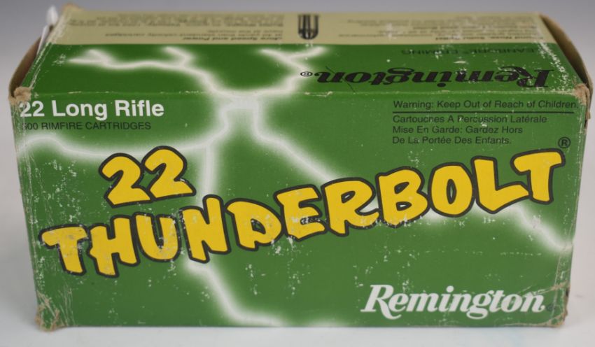 Five-hundred .22 Thunderbolt rifle cartridges, in original boxes. PLEASE NOTE THAT A VALID RELEVANT FIREARMS/SHOTGUN CERTIFICATE IS REQUIRED TO HANDLE/PURCHASE THIS ITEM.