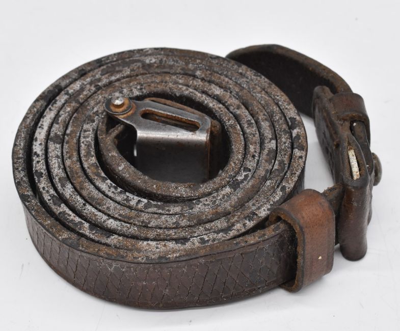 German WW2 Mauser K98 leather rifle sling stamped 'gxy 42' and 'WaA 80' under Nazi eagle.