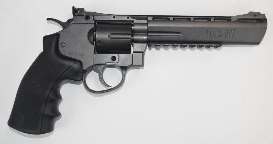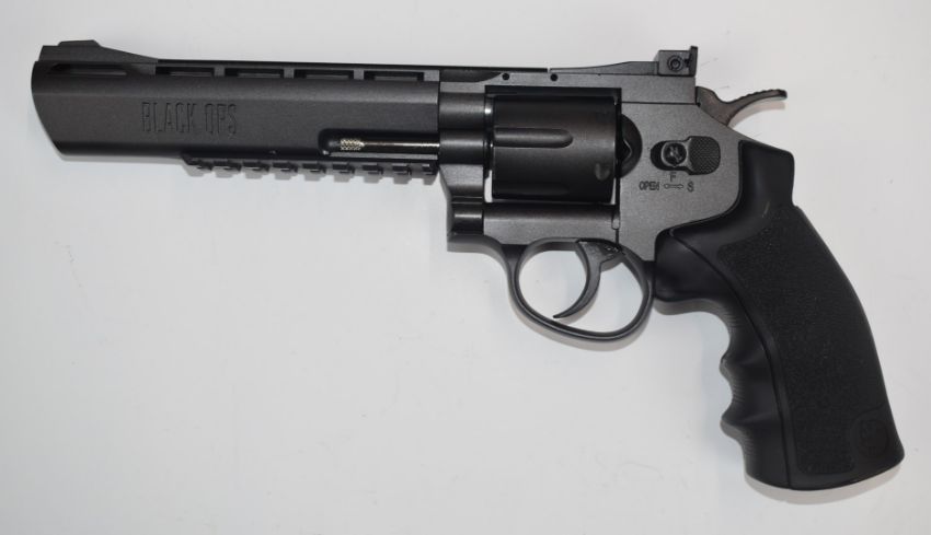 Black Ops The Justice Dealer .177 6" Co2 air pistol revolver with six shot cylinder, cartridge loader shells, adjustable sights and scope rail mount, serial number 13J34821, in original box with instructions and accessories.