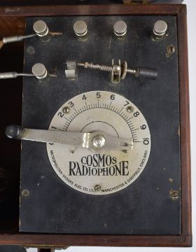 Cosmos Radiophone vintage crystal radio, housed in a mahogany box with headphones, width 22cm