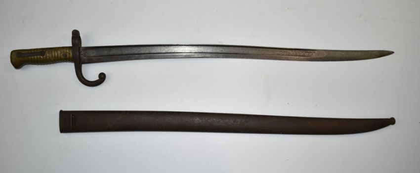 French 1866 pattern chassepot bayonet with 57cm yataghan blade and scabbard. PLEASE NOTE ALL BLADED ITEMS ARE SUBJECT TO OVER 18 CHECK ON COLLECTION OR DELIVERY