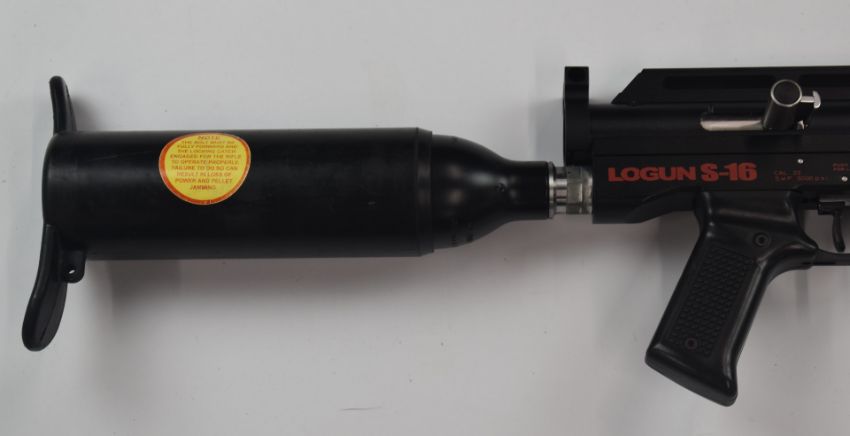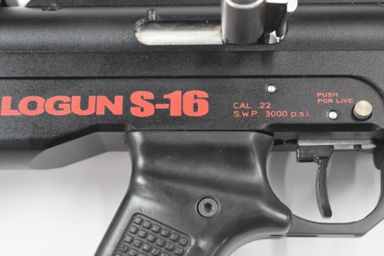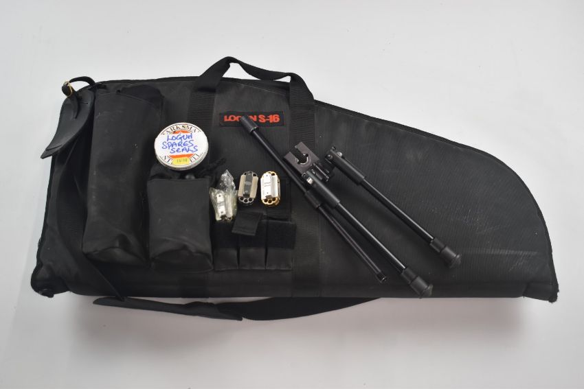Logun S-16 take down PCP air rifle with pistol grip, three 16 shot magazines, bi-pod and sound moderator, serial number 12090, in carry case